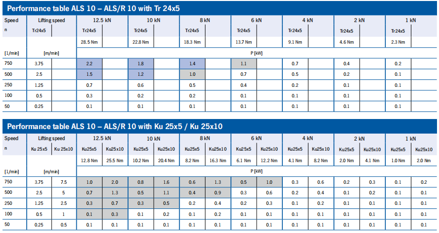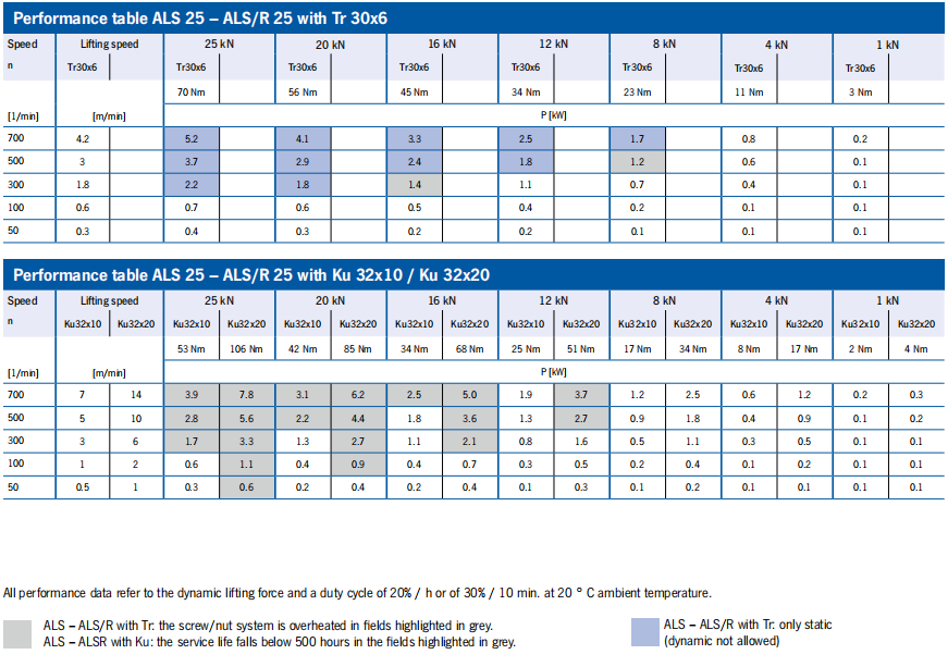 ALS/R Performance data tables ALS 10/25