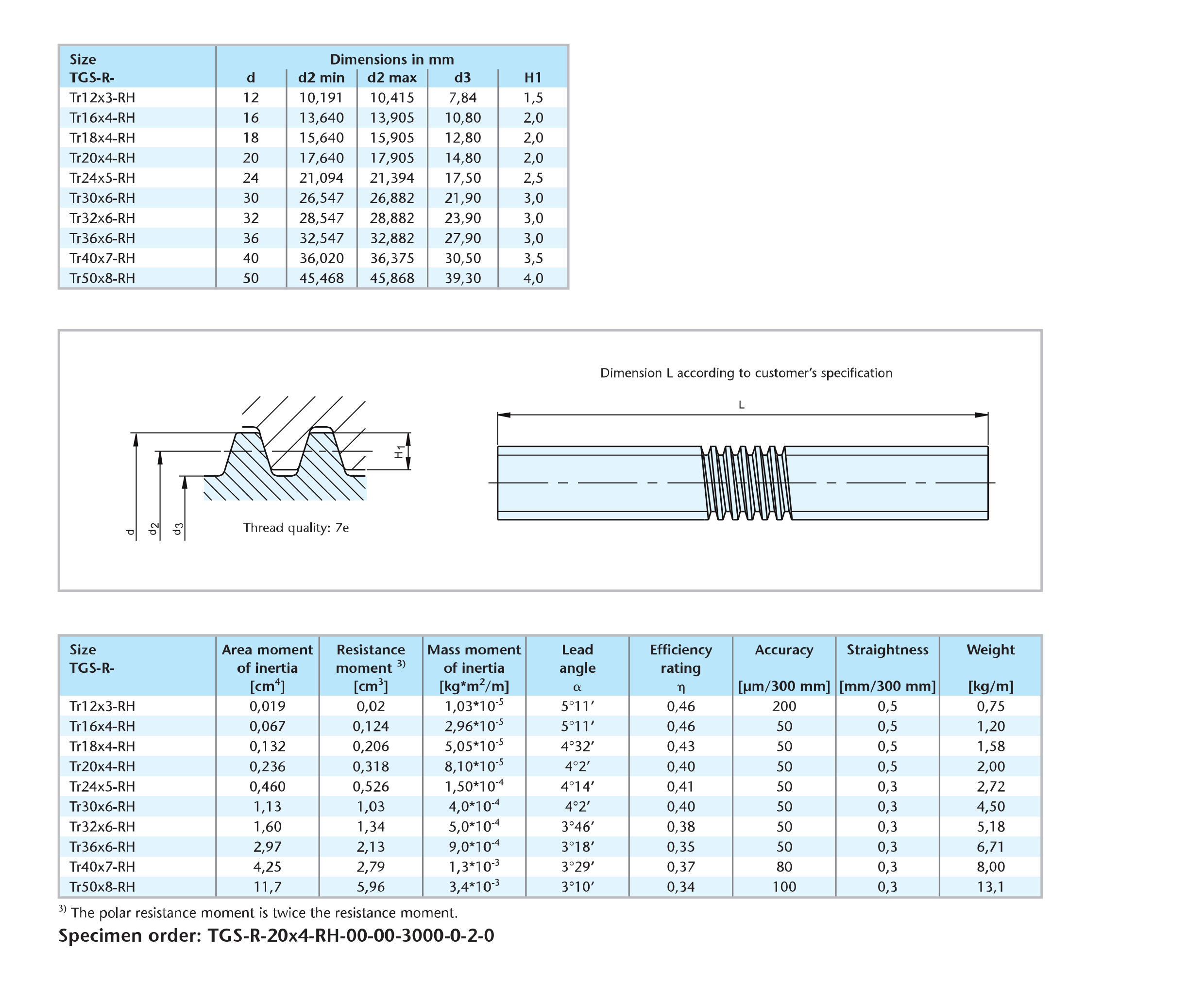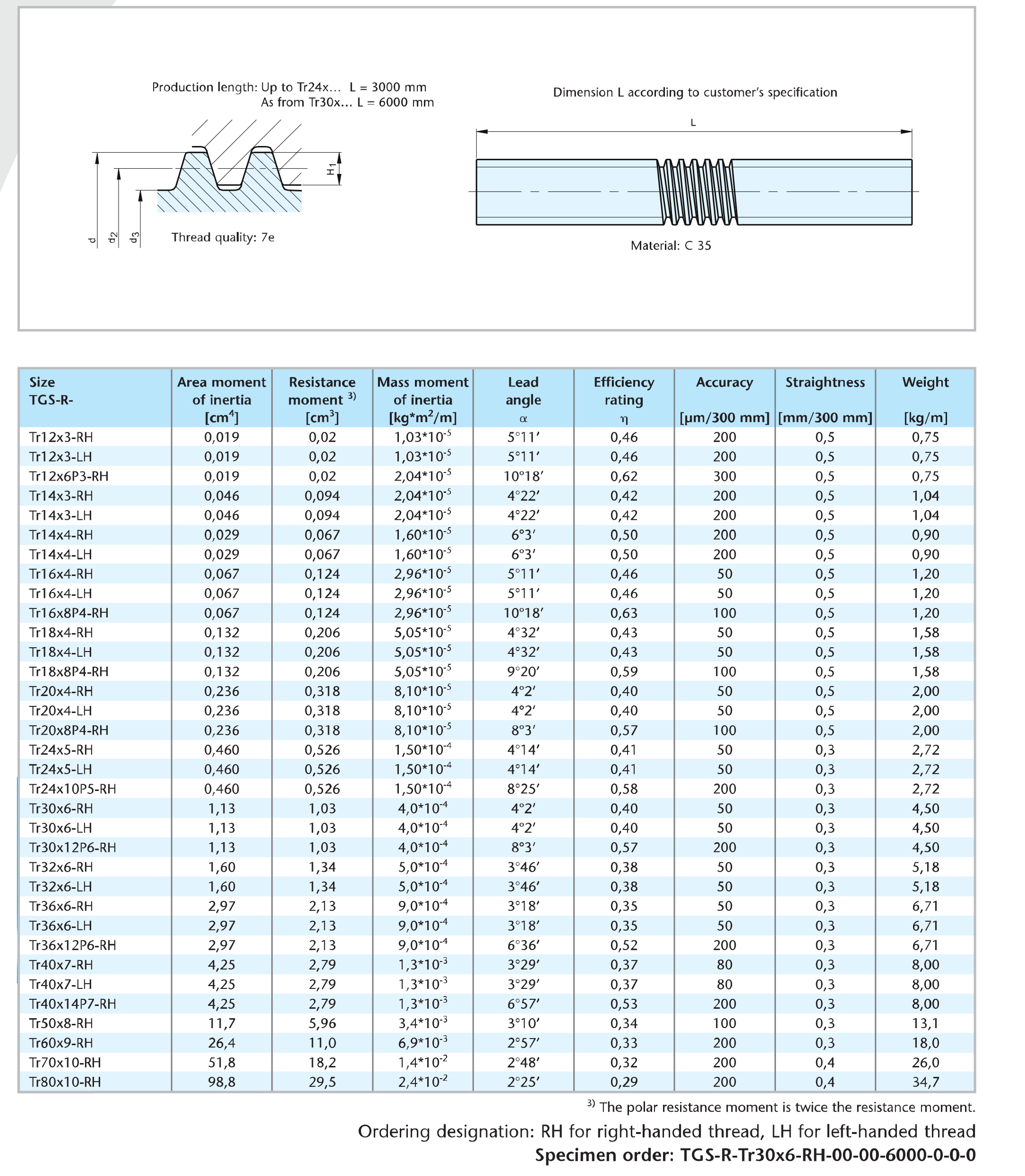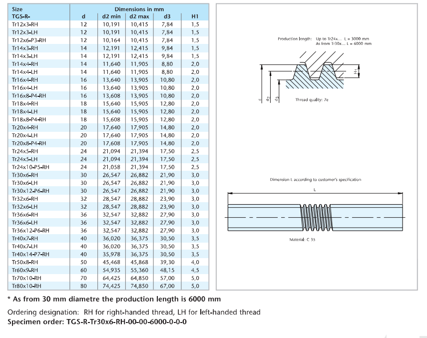 滾動(dòng)版本: 材料: 線程形式: 標(biāo)準(zhǔn)長度: 端加工: | C 35 (1.0501) 根據(jù) DIN 103-7e 的公制 ISO 梯形螺紋 Up to Tr24x... = 3000 mm As from Tr30x... = 6000 mm 鋸子或根據(jù)客戶的規(guī)格或客戶的圖紙 |